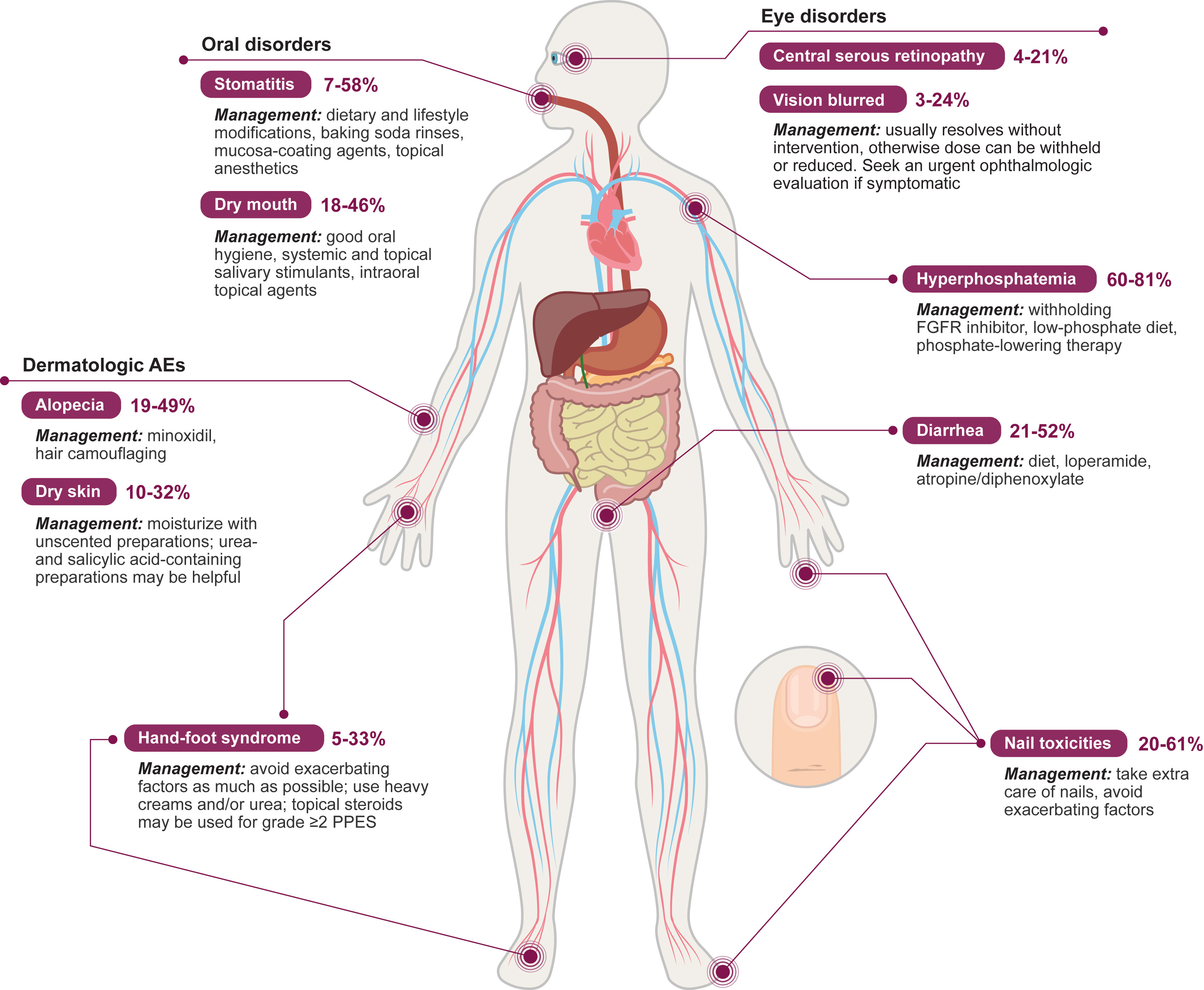 Эрдафитиниб может вызывать сухость кожи, а также изменения ногтей. На ногтях могут образоваться «гребни» или может произойти отторжение ногтевой пластины. Эти симптомы могут появиться через несколько месяцев после начала лечения, но могут продолжаться в течение многих месяцев после прекращения лечения.